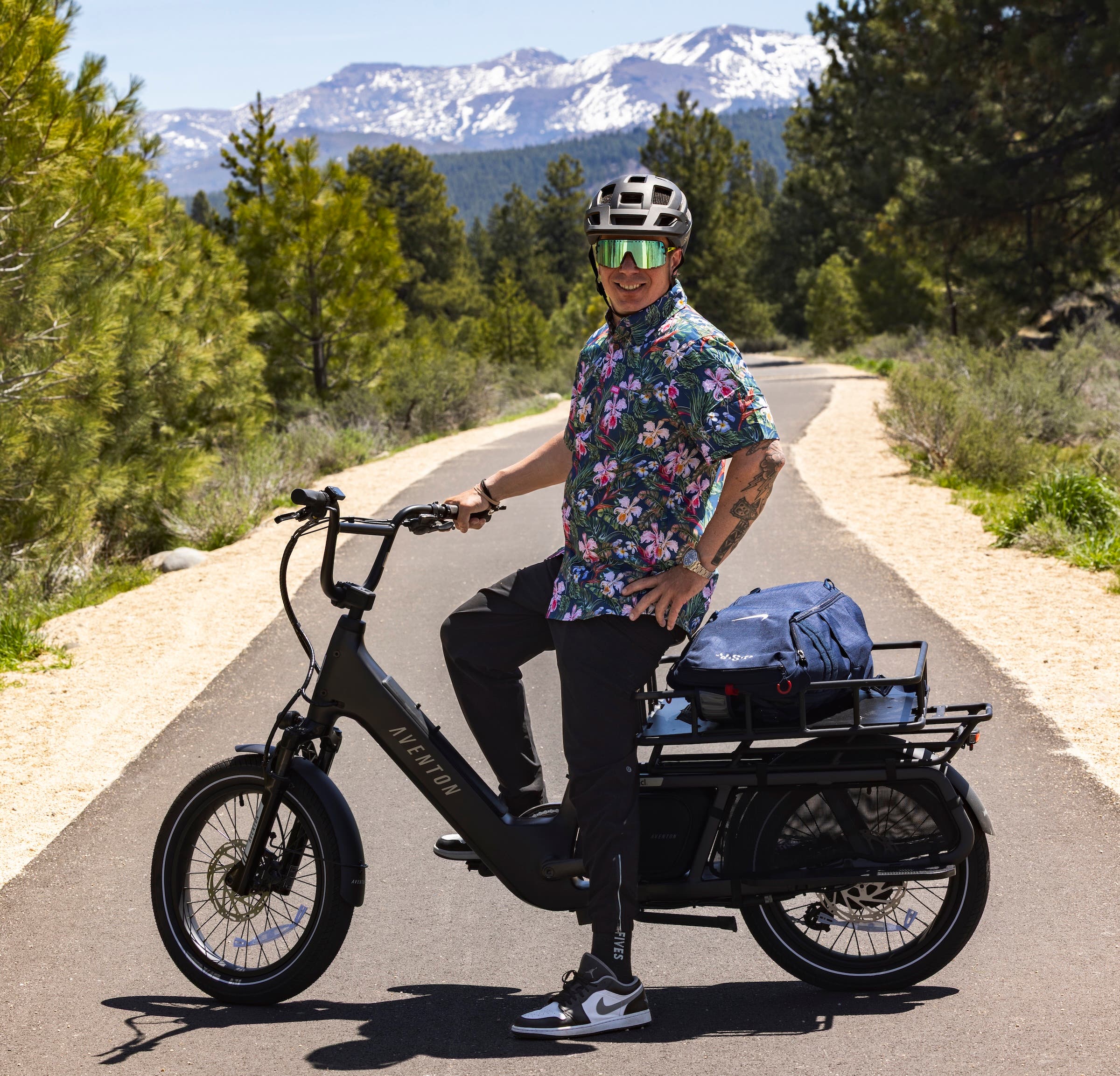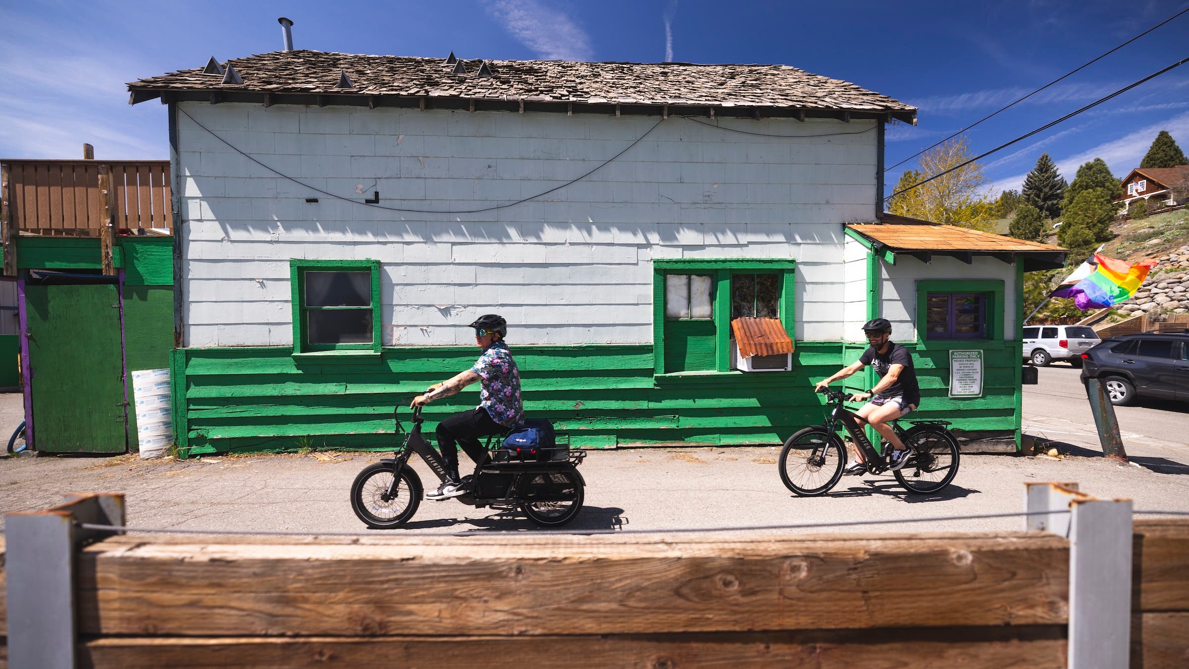 On a sunny April morning, Duff and Tuscany grab an Aventon Level 3 commuter e-bike and an Abound LR cargo fun-hauler. Using a combination of light pedal strokes with the bikes’ on-demand power (thanks to responsive hand throttles), Tuscany can crank the pedals aided by the pedal-assist function, while Duff focuses on overall stability, keeping his feet fixed in place. Once in motion, they confidently ride straight from High Fives’ doors to downtown Truckee under a canopy of blossoming trees.